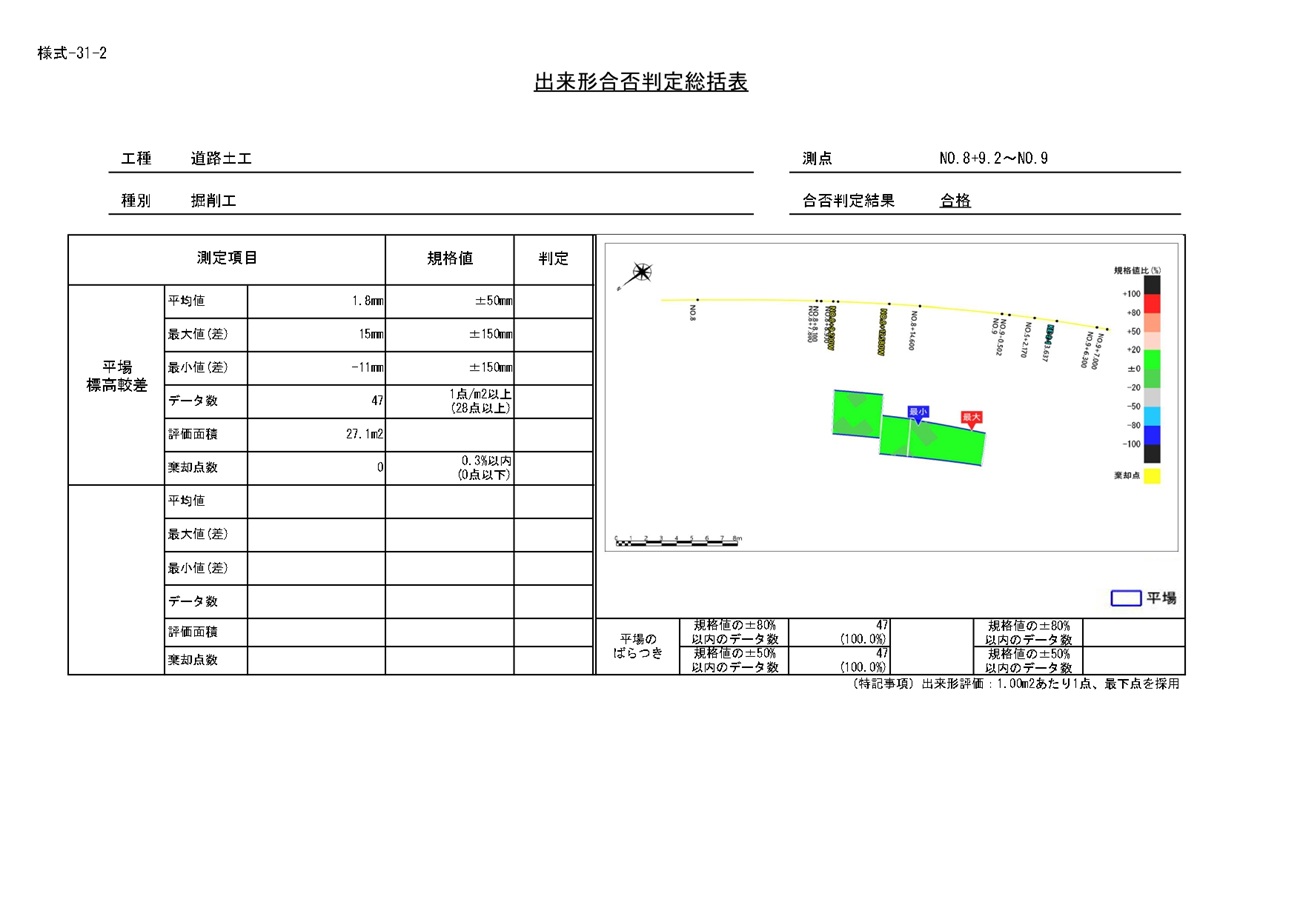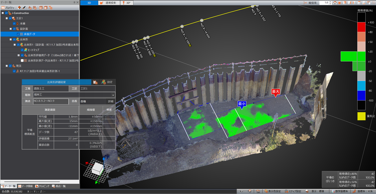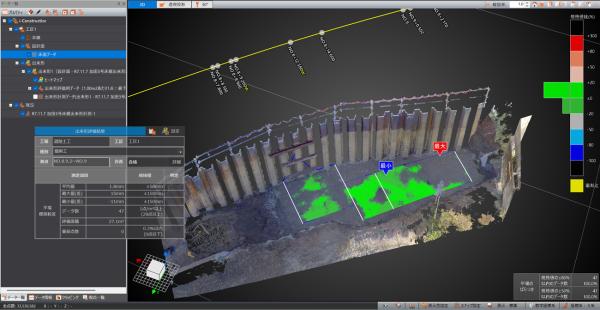 3次元設計データと出来形評価用データにてヒートマップを作成します。